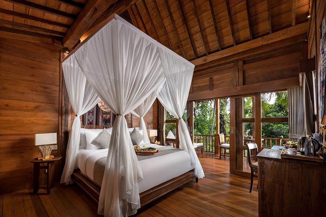 Surrounded by nature, our 17 Wooden Lodges offer a peaceful retreat where the warmth of Ubud home living meets elegant comfort. Built from natural wood and enriched with locally inspired details, each lodge sits seamlessly among rice fields, a flowing river, and the jungle landscape.